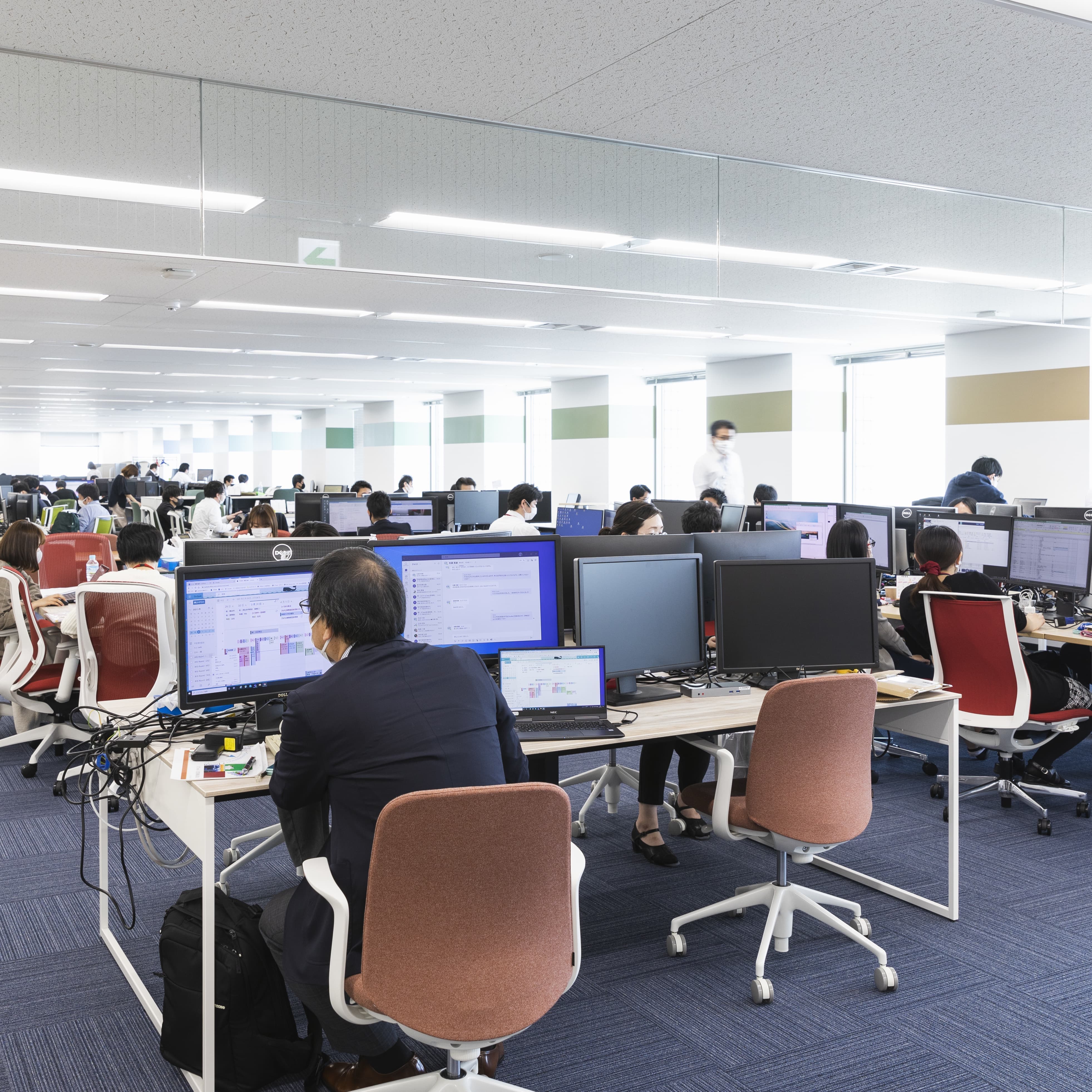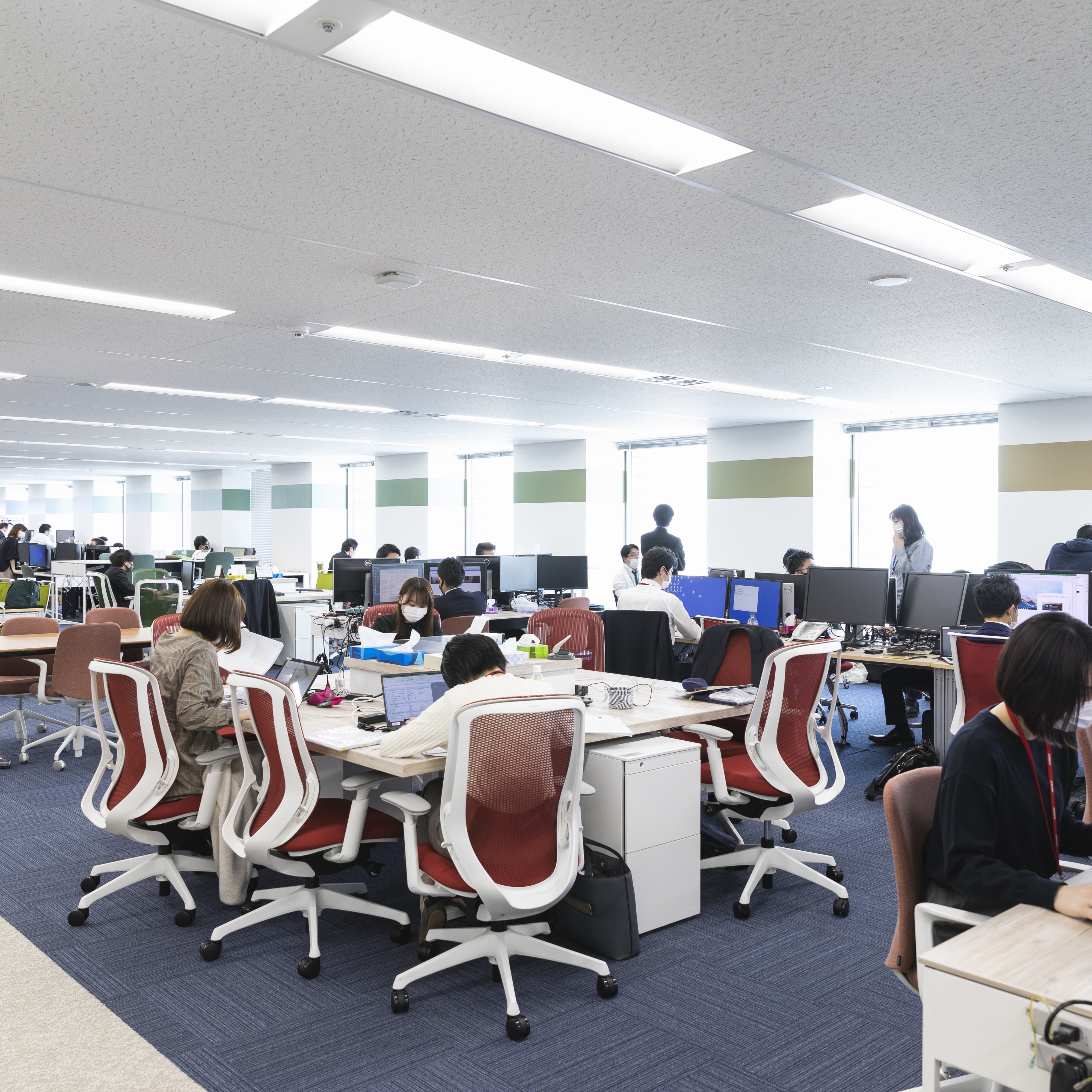 オネスト様の特性上、在席する時間が長いため、社長様が従業員様のことを想い、会社で一日中体に触れている椅子には特にこだわりがありました。社長はじめ移転プロジェクトのメンバーの方々にメーカーショールームへおこし頂き、実際に体感いただき、椅子の確定となりました。レイアウト全体でも【オネストカラー】を前面に打ち出すことができたカラフルかつクリエイティブなオフィスをご提案させていただきました。